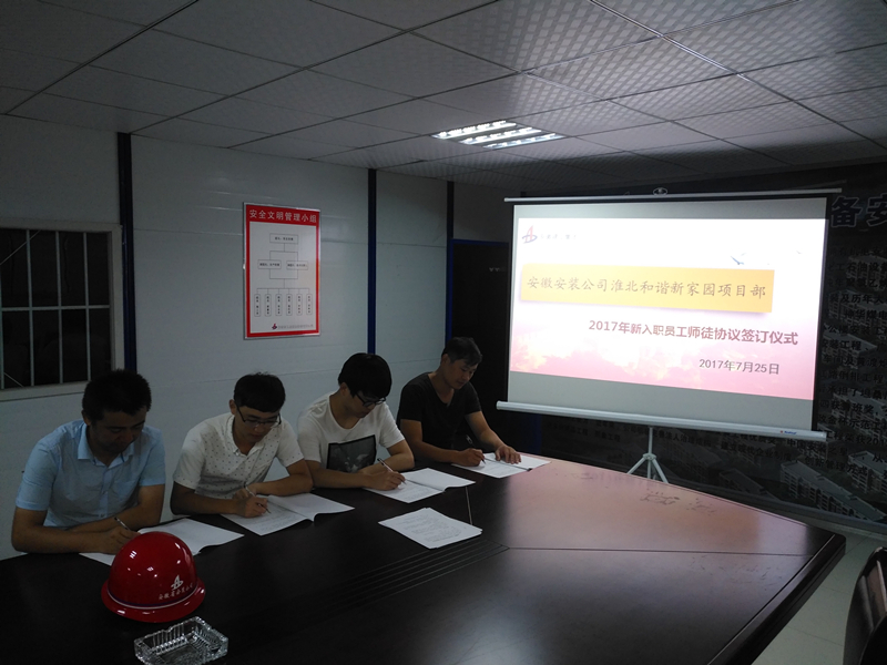 7月25日晚,安徽安裝公司淮北和諧新家園項目部精心策劃,嚴密組織,精選出思想作風(fēng)扎實(shí),工作經(jīng)驗豐富,專(zhuān)業(yè)素質(zhì)過(guò)硬的老師傅與新入職員工舉行莊重的師徒協(xié)議書(shū)簽訂儀式。