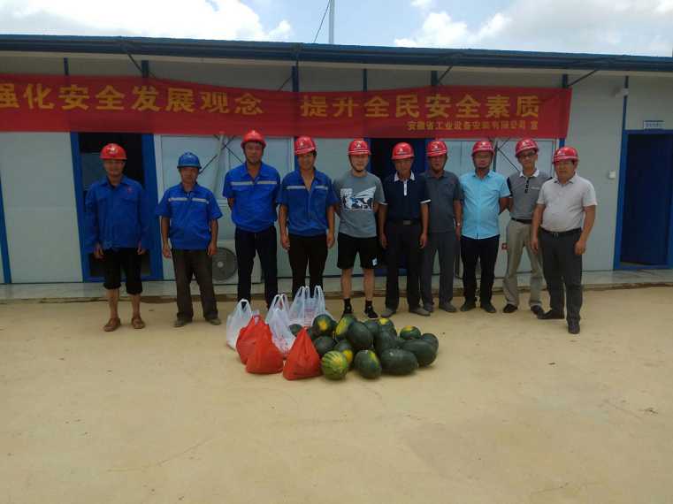 烈日炎炎,酷暑難當,6月28日上午,安裝安裝第四分公司經(jīng)理趙永峰在分公司副經(jīng)理姜田斌,工程科、安全科負責人的陪同下,來(lái)到廣東省清遠市印染行業(yè)污水處理項目,看望和慰問(wèn)奮戰在一線(xiàn)的員工,為他們送去綠豆、白糖、西瓜、藿香正氣水、十滴水、仁丹等防暑降溫物品,實(shí)地察看了項目工地和職工生活區,并與項目同志進(jìn)行了座談交流 。