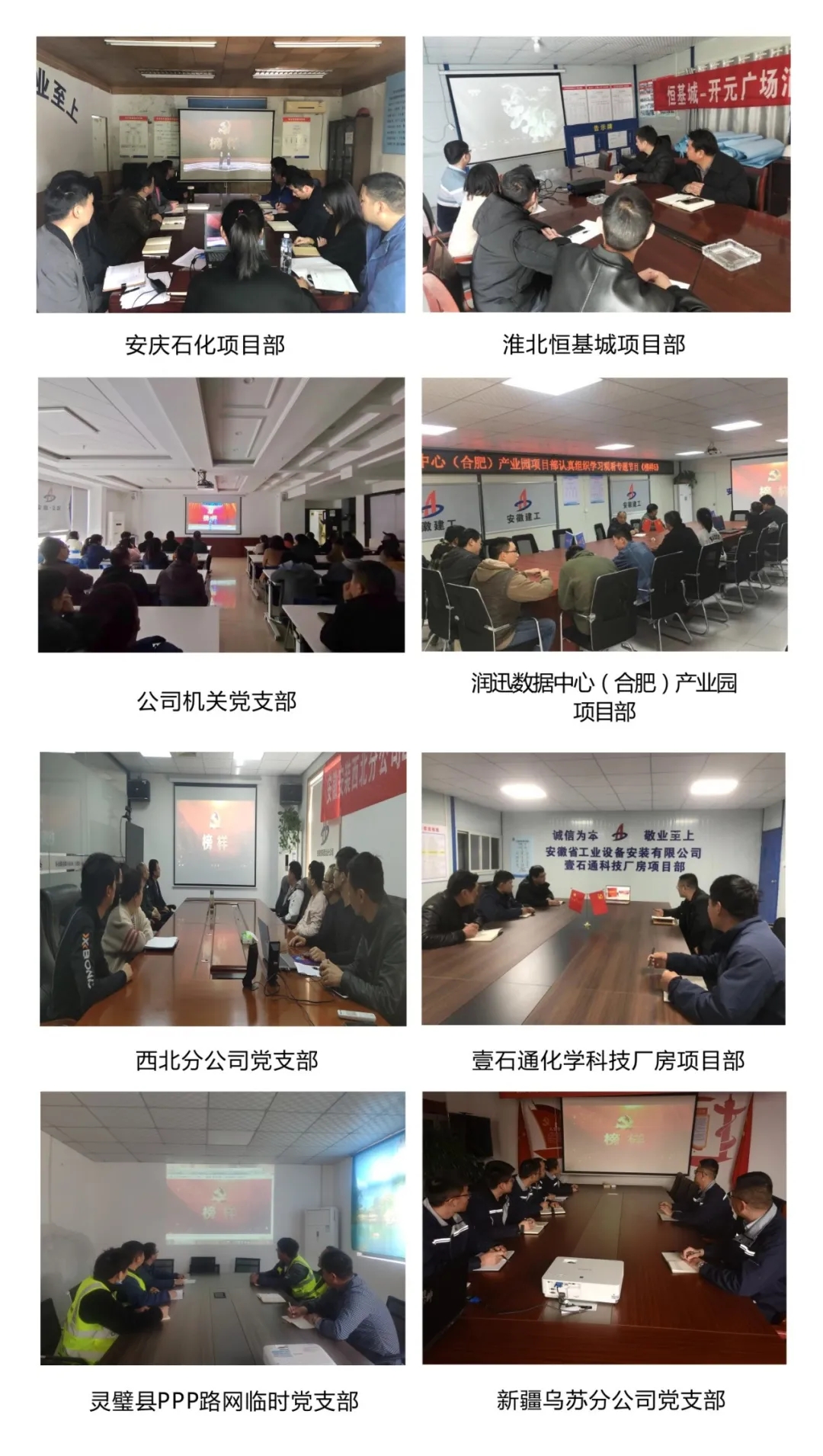靈璧縣PPP路網(wǎng)臨時(shí)黨支部、壹石通化學(xué)科技廠(chǎng)房項目、潤迅數據中心(合肥)產(chǎn)業(yè)園項目、蚌埠康寧藥用玻璃管項目、安慶石化項目部于3月22日晚上立即組織共同觀(guān)看《榜樣5》,并視頻討論、召開(kāi)會(huì )議等多種形式進(jìn)行學(xué)習交流。
