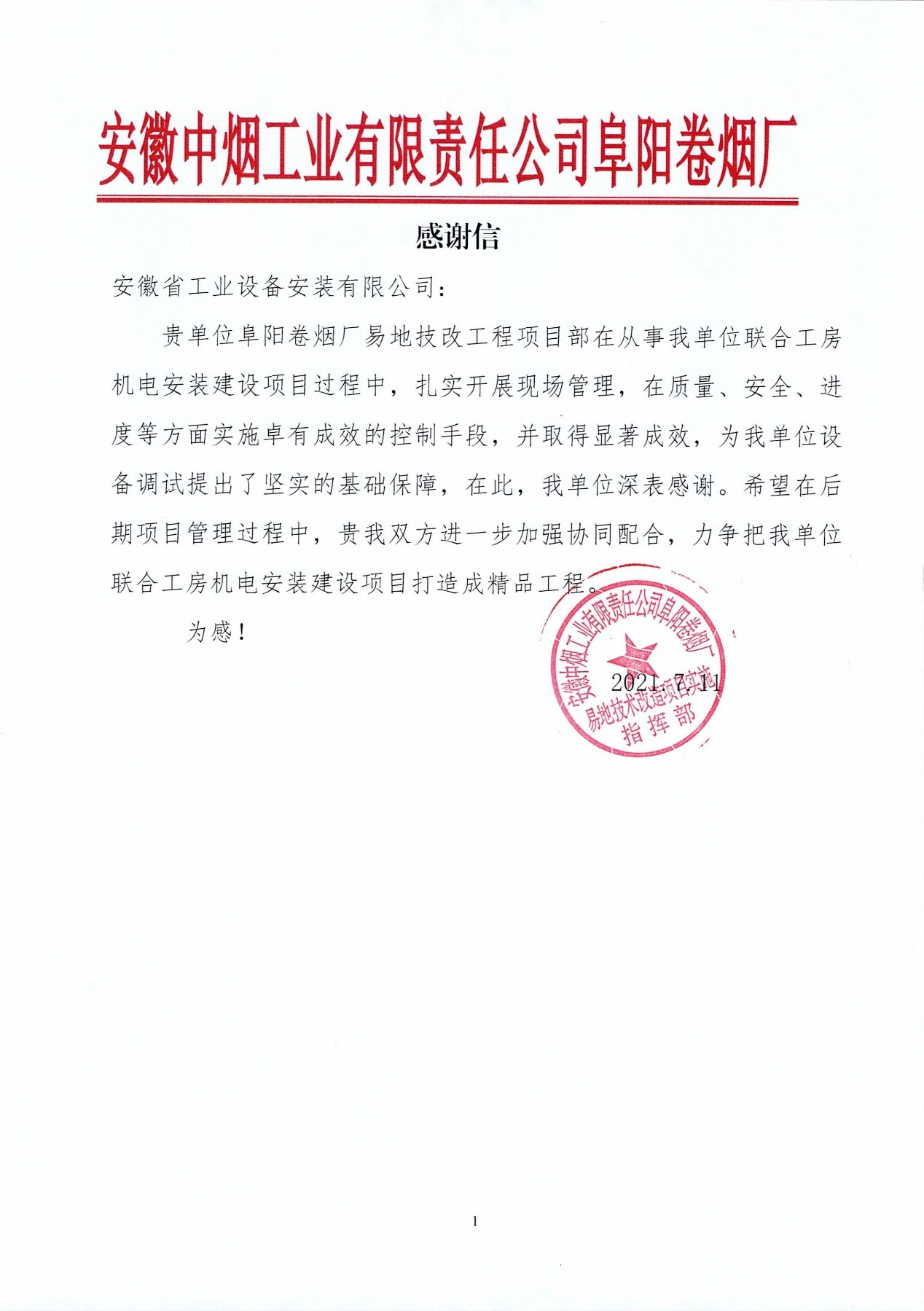 7月11日下午,安徽安裝蚌埠分公司收到安徽中煙阜陽(yáng)卷煙廠(chǎng)發(fā)來(lái)的感謝信。信中對安徽安裝蚌埠分公司承建的聯(lián)合工房機電安裝項目表達了充分認可和高度贊譽(yù)。