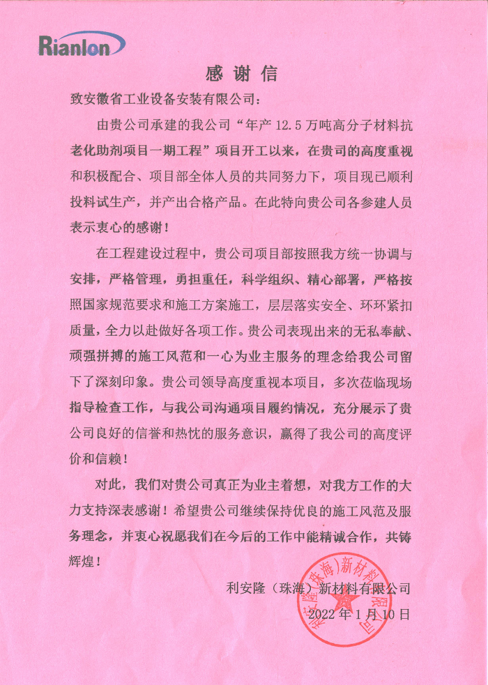 近日,利安?。ㄖ楹#┬虏牧嫌邢薰鞠虬不瞻惭b公司致感謝信,對安徽安裝公司“年產(chǎn)12.5萬(wàn)噸高分子材料抗老化助劑項目一期工程”實(shí)現順利投產(chǎn)運行產(chǎn)出合格產(chǎn)品表示祝賀,對項目部全體參建人員付出的艱辛努力與貢獻給予感謝。