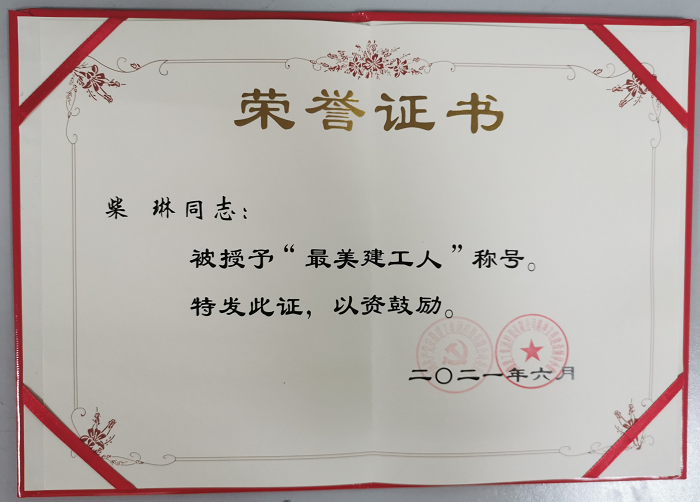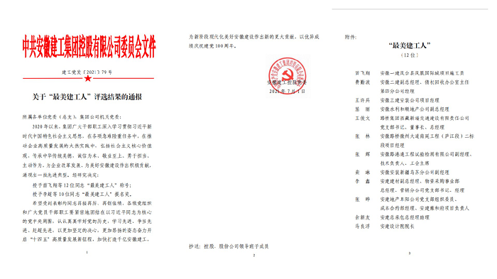 7月1日至7月2日,安徽建工集團控股有限公司二屆一次職工代表大會(huì )暨“七一”表彰會(huì )在合肥召開(kāi)。會(huì )上表彰了12名“最美建工人”榮譽(yù)稱(chēng)號獲得者,安徽安裝公司柴琳獲此殊榮。