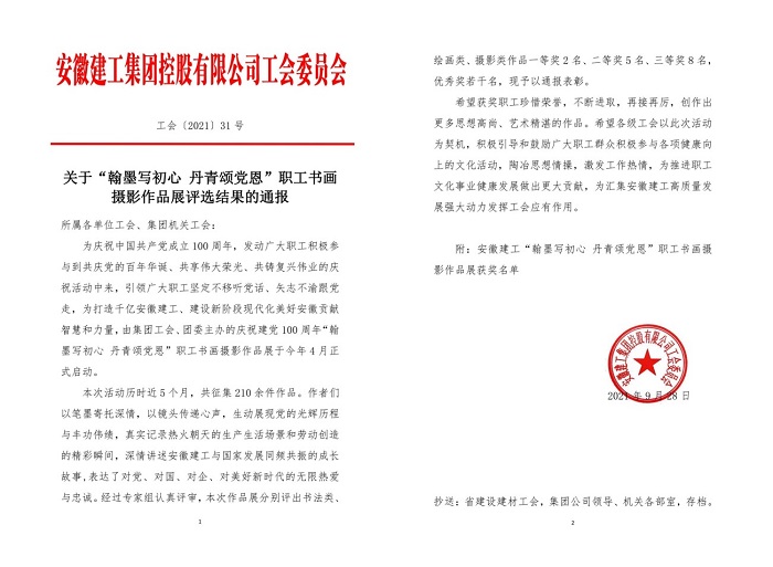 9月29日,集團公司工會(huì )通報了“翰墨寫(xiě)初心 丹青頌黨恩”職工書(shū)畫(huà)攝影作品展評選結果,安徽安裝公司選送的五幅作品榜上有名。其中馬金鑫的油畫(huà)作品《支部建在項目上》榮獲繪畫(huà)類(lèi)一等獎,任禹豪的攝影作品《幸福是干出來(lái)的》榮獲攝影類(lèi)二等獎,化范寶的硬筆書(shū)法作品《沁園春·雪》和程茂麗的攝影作品《攀登》、胡欣欣的攝影作品《齊心》分別榮獲書(shū)法類(lèi)優(yōu)秀獎和攝影類(lèi)優(yōu)秀獎。