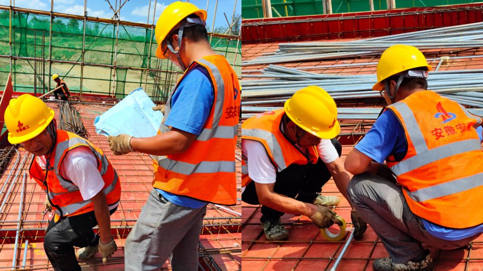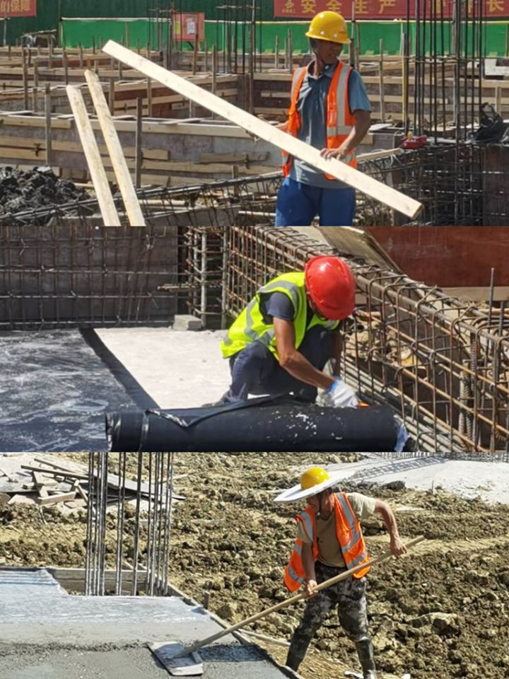 合肥分公司肥西安信立士項目一線(xiàn)工人在熱浪滾滾中堅守崗位;圖為木工支模、貼防水卷材及地坪抹平施工。