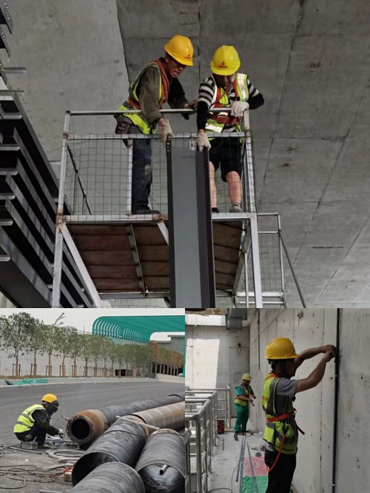 合肥分公司花園大道項目一線(xiàn)工人不遺余力苦干實(shí)干,汗水和膚色就是最好的見(jiàn)證;圖為隧道內橋架安裝、管道預制焊接及雨水泵房電氣配管施工。
