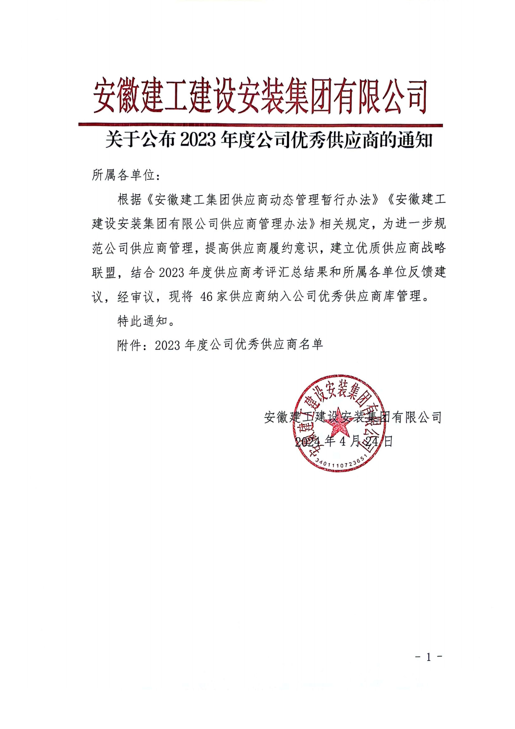 關(guān)于公布2023年度公司優(yōu)秀供應商的通知