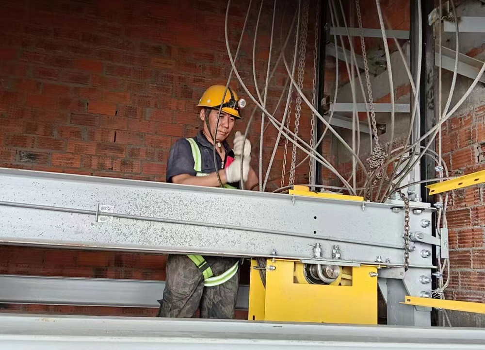 長(cháng)三角一體化中新蘇滁高新區高端智能制造產(chǎn)研基地項目現場(chǎng)安裝人員正在收緊鋼絲繩、調整電梯緩沖距離
