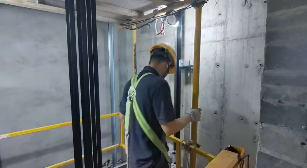 現場(chǎng)施工人員正在轎頂進(jìn)行安裝