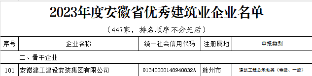 近日,安徽省住房和城鄉建設廳、安徽省交通運輸廳、安徽省水利廳、安徽省通信管理局聯(lián)合發(fā)布《關(guān)于公布2023年度安徽省優(yōu)秀建筑業(yè)企業(yè)名單的通知》(建辦〔2025〕41號),安徽建工建設安裝集團有限公司入選“2023年度安徽省優(yōu)秀建筑業(yè)企業(yè)”。