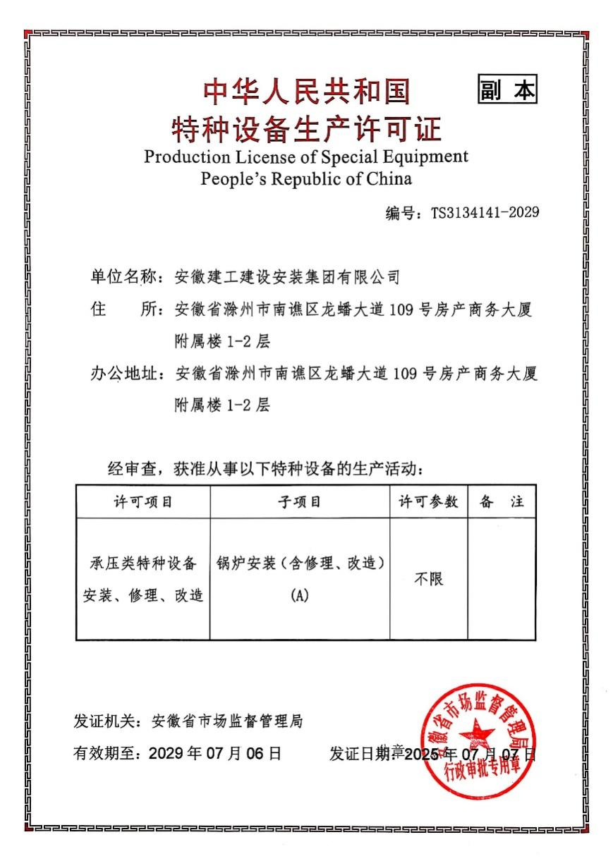 近日,建工安裝“承壓類(lèi)特種設備安裝、修理、改造—鍋爐安裝(含修理、改造)(A)”新證申報工作順利通過(guò)安徽省特種設備檢測院等各方的評審核查,現已取得安徽省市場(chǎng)監督管理局頒發(fā)的新證。